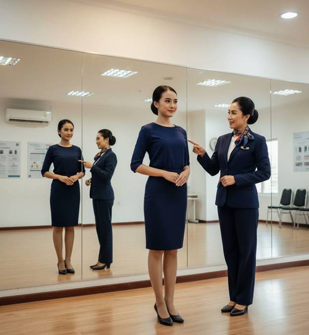 Postur tubuh yang baik tidak datang begitu saja, melainkan membutuhkan latihan otot inti, pengaturan napas, dan kesadaran tubuh yang konsisten. Pramugari sering kali harus berdiri atau berjalan selama berjam-jam, sehingga postur yang salah dapat menyebabkan kelelahan atau bahkan cedera. Oleh karena itu, latihan postur menjadi bagian penting dalam pelatihan dasar pramugari untuk menjaga kebugaran dan kenyamanan saat bertugas. Melalui latihan ini, mereka belajar bagaimana menahan posisi tubuh dengan benar tanpa merasa lelah berlebihan. Pengaturan napas yang tepat juga membantu menjaga kestabilan dan energi sepanjang hari. Kesadaran tubuh yang tinggi membuat pramugari lebih mudah menyesuaikan diri dengan situasi kerja yang dinamis. Dengan postur yang baik, mereka dapat tampil profesional sekaligus menjaga kesehatan jangka panjang.