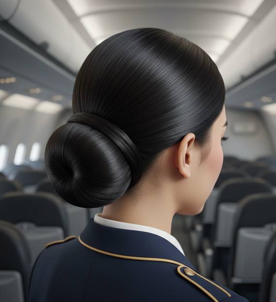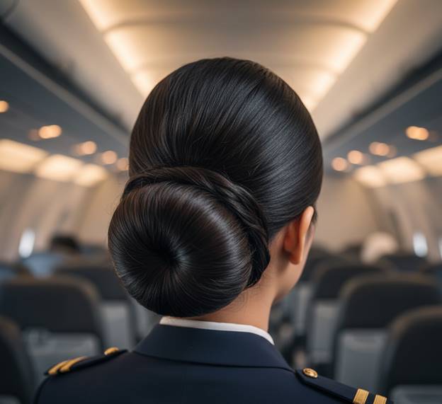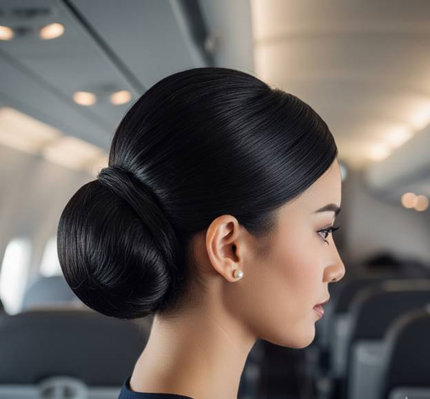 Gaya classic bun menjadi pilihan utama karena memberikan kesan elegan yang abadi dan mudah dipadukan dengan berbagai standar seragam maskapai. Gaya ini sangat ideal baik untuk wajah bulat maupun tirus karena mampu menonjolkan struktur wajah secara natural tanpa berlebihan. Pengikatannya yang rapi membantu menahan rambut tetap stabil meski bekerja dalam durasi panjang yang menuntut mobilitas tinggi. Tampilan ini memberikan kesan profesional yang langsung terlihat sejak pertama kali bertemu penumpang di kabin. Selain itu, gaya ini mudah dirawat dan tidak membutuhkan banyak aksesori tambahan sehingga praktis untuk digunakan setiap hari. Banyak maskapai menerapkan classic bun sebagai standar karena mencerminkan disiplin tinggi dan citra perusahaan yang kuat. Dengan teknik yang tepat, hasilnya bisa sangat presisi dan simetris sehingga tampak sempurna di berbagai sudut. Inilah sebabnya gaya ini sering digunakan dalam sesi foto resmi maupun uniform inspection.