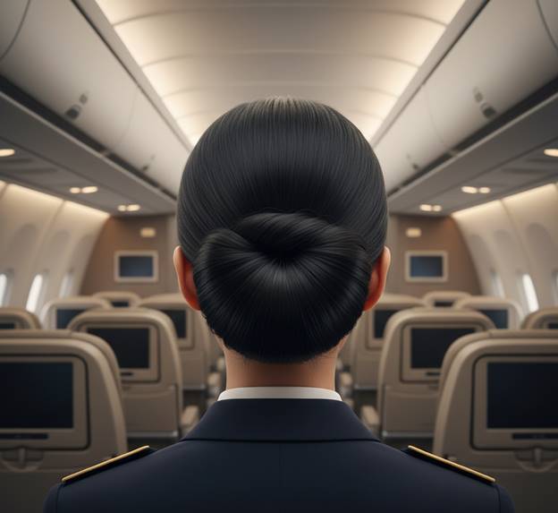 Gaya low sleek bun menawarkan tampilan modern yang sederhana namun sangat berkelas untuk dipakai dalam berbagai kondisi penerbangan. Letaknya yang rendah membantu wajah bulat terlihat lebih tirus dan proporsional. Pada wajah tirus, gaya ini memberi kesan halus yang menyeimbangkan garis wajah. Rambut yang disisir rapi ke belakang menghadirkan tampilan tegas tetapi tetap elegan dan harmonis. Gaya ini juga sangat stabil serta minim risiko berantakan meskipun digunakan dalam durasi penerbangan yang panjang. Banyak pramugari di maskapai internasional memilih gaya ini karena efisiensinya dalam proses grooming harian. Selain mudah dibuat, tampilannya tetap sesuai standar grooming global yang menjunjung kerapian dan profesionalisme. Teksturnya yang sleek memberikan aura profesional yang kuat dan memikat.