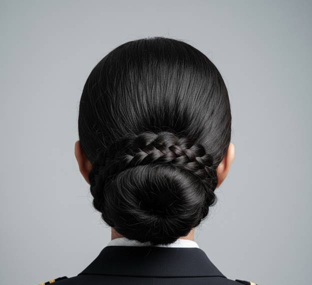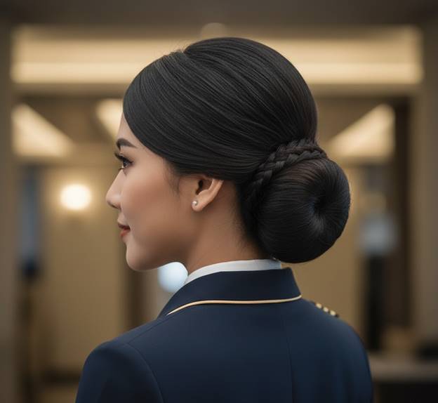 Braided bun menjadi pilihan tepat bagi mereka yang ingin tampil kreatif namun tetap berada dalam batas profesionalisme pramugari. Kepangan pada rambut memberikan tekstur yang menciptakan dimensi visual menarik dan membuat tampilan lebih hidup. Gaya ini sangat cocok untuk wajah bulat karena menciptakan ilusi vertikal yang membuat wajah tampak lebih panjang. Sementara itu, untuk wajah tirus, tambahan volume dari kepangan membantu menyeimbangkan proporsi wajah agar tidak terlihat terlalu panjang. Gaya ini juga memberi kesan manis dan feminin tanpa meninggalkan aura profesional. Selain itu, bentuknya tetap terlihat rapi meskipun memiliki detail tekstur yang cukup kompleks. Banyak pramugari muda menggemari gaya ini karena tampilannya yang fresh dan modern dalam berbagai kesempatan tugas. Meski terlihat rumit, gaya ini sebenarnya cukup mudah dibuat jika dilatih dengan teknik yang benar.