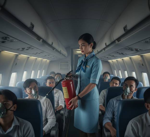 Kebakaran dalam pesawat merupakan situasi darurat yang harus segera diatasi dengan cepat dan tepat. Tanda-tanda seperti bau terbakar, asap tipis, atau percikan api wajib direspons tanpa menunda waktu agar tidak berkembang menjadi bahaya serius. Pramugari harus sigap menemukan sumber masalah, mengamankan area sekitar, dan menggunakan portable fire extinguisher yang tersedia di kabin. Komunikasi efektif dengan kokpit juga sangat penting agar pilot dapat mengambil langkah lanjutan yang diperlukan untuk keselamatan penerbangan. Dalam situasi ini, koordinasi antara kru kabin dan awak kokpit menjadi kunci utama keselamatan penumpang dan awak pesawat. Setiap detik sangat berharga untuk mengendalikan situasi, mengurangi risiko cedera, dan melindungi semua orang di dalam kabin. Pelatihan darurat kebakaran selalu menjadi bagian penting dalam pembinaan pramugari agar siap menghadapi kondisi kritis seperti ini dengan tenang dan profesional. Pemahaman prosedur, penggunaan alat pemadam, dan tindakan cepat menjadikan keselamatan penerbangan tetap terjaga bahkan dalam situasi paling darurat.