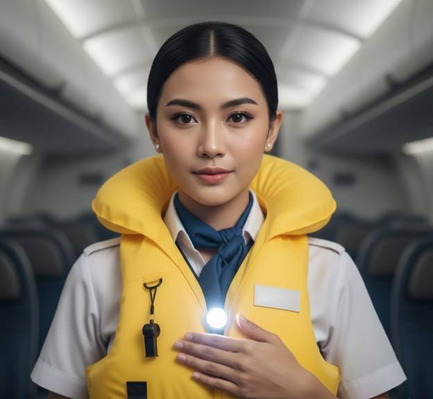 Life vest atau jaket pelampung adalah perlengkapan keselamatan dasar dalam setiap penerbangan yang melintasi wilayah perairan. Benda ini biasanya terletak di bawah kursi penumpang dan dilengkapi dengan peluit serta lampu kecil untuk membantu proses pencarian saat malam hari. Dalam pelatihan, pramugari diajarkan cara mengenakan life vest dengan cepat dan benar, termasuk cara mengaktifkan inflasi manual dan otomatis. Mereka juga dilatih untuk tetap tenang dan sigap saat membimbing penumpang dalam situasi darurat. Pemahaman yang kuat terhadap penggunaan alat ini sangat penting dalam mendukung keberhasilan evakuasi air. Oleh karena itu, penguasaan prosedur terkait life vest menjadi salah satu kompetensi inti dalam pelatihan keselamatan penerbangan. Selain itu, kemampuan menjelaskan penggunaannya dengan jelas kepada penumpang merupakan bagian penting dari tugas pramugari.
