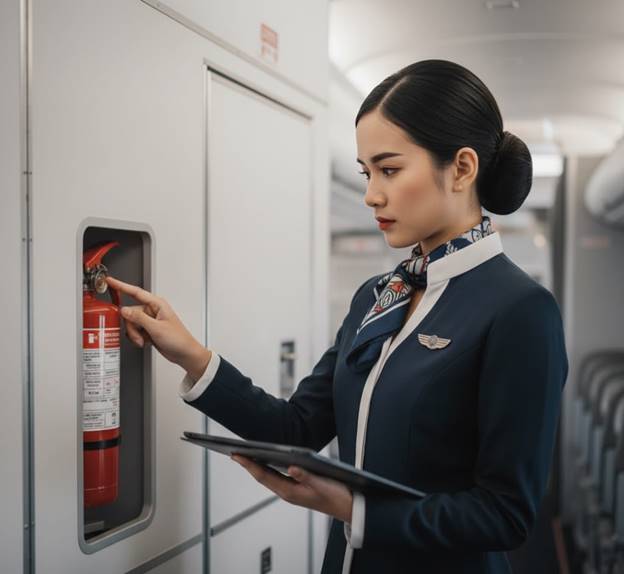 Selain memeriksa area tempat duduk penumpang, pramugari juga harus mengecek emergency equipment. Ini termasuk oxygen bottle, pemadam api, first aid kit, serta alat bantu evakuasi lainnya. Semua peralatan harus dalam kondisi siap pakai, dengan segel yang masih utuh dan indikator yang menunjukkan kondisi normal. Pemeriksaan rutin ini wajib dilakukan sebelum penerbangan dimulai. Setiap pramugari bertanggung jawab memastikan perlengkapan darurat berfungsi dengan baik. Jika ada kerusakan atau kekurangan, harus segera dilaporkan untuk penanganan cepat. Kesiapan alat ini sangat penting demi keselamatan penumpang dan kru selama penerbangan.