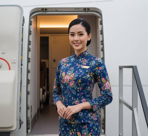 Singapore Airlines tetap setia dengan kebaya sebagai simbol budaya dan professionalism sejak dekade 1970-an. Seragam ini memiliki warna biru tua yang kaya, dikombinasikan dengan motif batik khas dan potongan ramping yang mempertegas siluet tubuh. Desainnya mempertahankan unsur tradisional namun dengan pendekatan functional agar tetap nyaman dikenakan saat bertugas. Penambahan garis emas dan merah pada motif memberi kesan mewah dan elegan. Kebaya ini bukan sekadar busana kerja, melainkan bagian dari brand identity keramahan khas Asia Tenggara. Tidak hanya disukai oleh penumpang Asia, tapi juga dihormati oleh penumpang internasional sebagai gaya iconic. Keanggunan dan kedisiplinan tercermin dari cara pramugari membawakan busana ini. Seragam ini menjadi bukti bagaimana heritage dan fashion dapat berpadu dalam industri penerbangan modern.
