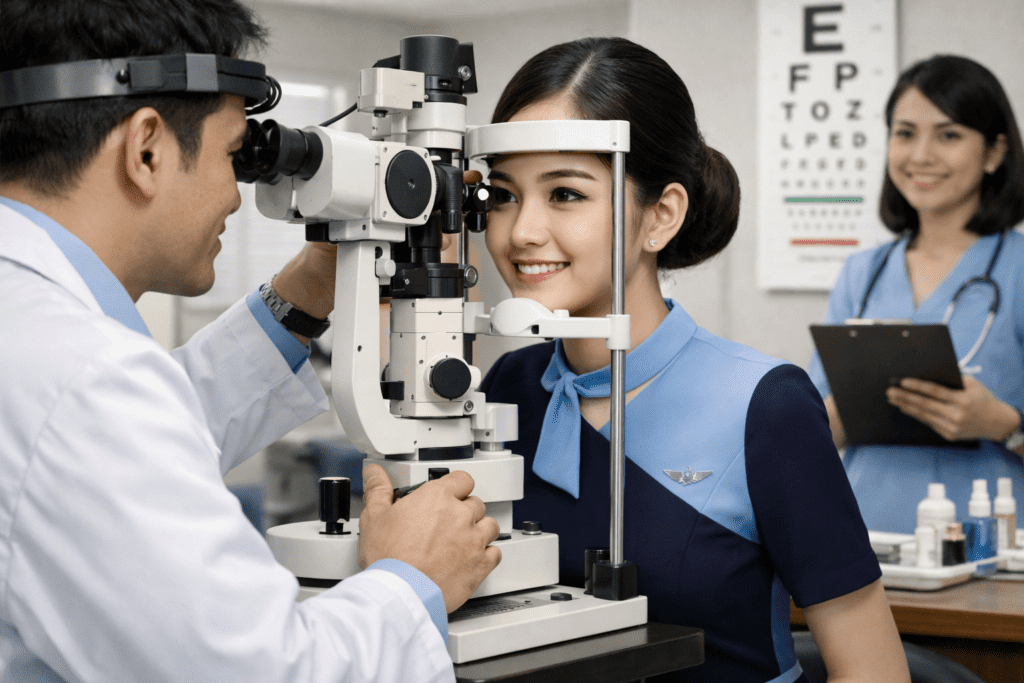 Kesehatan mata sangat penting bagi seorang pramugari karena pekerjaan ini menuntut ketelitian, respons cepat, dan kemampuan melihat dengan jelas dalam berbagai kondisi. Mulai dari membaca instruksi keselamatan, memantau situasi kabin, hingga menghadapi kondisi darurat, semuanya membutuhkan penglihatan yang optimal. Inilah alasan mengapa standar kesehatan mata menjadi bagian krusial dalam proses seleksi awak kabin.