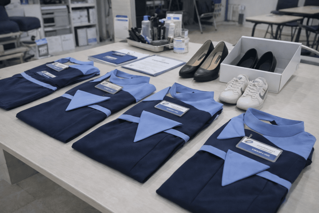 Uang pangkal ini umumnya sudah mencakup berbagai kebutuhan dasar siswa selama pendidikan. Dalam paket biaya awal biasanya termasuk seragam praktik resmi, sepatu standar pelatihan, atribut seperti name tag dan scarf, serta perlengkapan grooming. Seragam bukan hanya sekadar pakaian praktik, tetapi juga bagian dari pembentukan karakter profesional. Sejak hari pertama, siswa dibiasakan tampil rapi, bersih, dan sesuai standar pelayanan industri transportasi.
