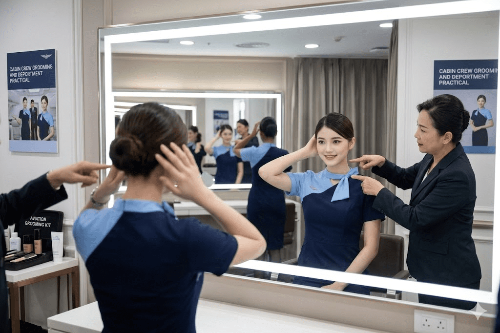 Penampilan sangat penting dalam profesi pramugari karena menjadi kesan pertama bagi penumpang. Dalam materi grooming pramugari, siswa diajarkan cara merawat diri secara menyeluruh, mulai dari penataan rambut, penggunaan make-up yang alami hingga menjaga kebersihan kulit dan teknik berdiri serta berjalan dengan postur yang baik. Standar grooming ini biasanya mengacu pada maskapai nasional seperti Garuda Indonesia yang dikenal dengan tampilan rapi dan berkelas. Pembelajaran ini tidak hanya untuk estetika, tetapi juga untuk membangun kesan profesional sesuai dengan standar industri penerbangan.