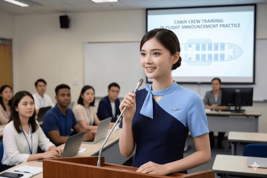 Selain kemampuan bahasa, public speaking juga dilatih secara intensif melalui praktik langsung. Siswa berlatih mengumumkan informasi sebelum lepas landas, saat turbulensi ringan, hingga dalam situasi tertentu yang membutuhkan penjelasan cepat. Latihan ini bertujuan agar suara terdengar tenang, tegas, dan meyakinkan.