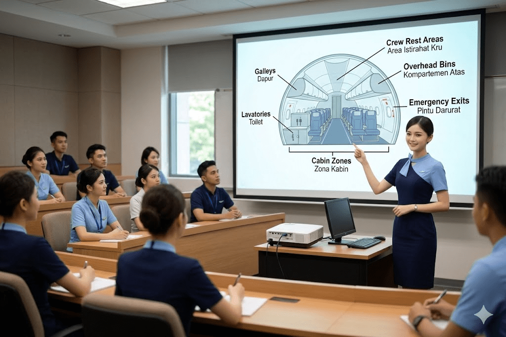 Calon pramugari juga mendapatkan materi pengenalan bagian-bagian pesawat dan fungsinya sebagai bekal dasar sebelum terjun ke dunia kerja. Mereka mempelajari struktur kabin, posisi pintu darurat, galley, lavatory, dan lokasi peralatan keselamatan seperti pemadam kebakaran dan life vest. Pengetahuan ini penting agar awak kabin memahami lingkungan kerja dan mampu bertindak cepat dalam berbagai situasi. Dengan memahami struktur pesawat secara detail, pramugari dapat bekerja lebih terarah, efisien, dan sesuai prosedur keselamatan penerbangan yang berlaku.