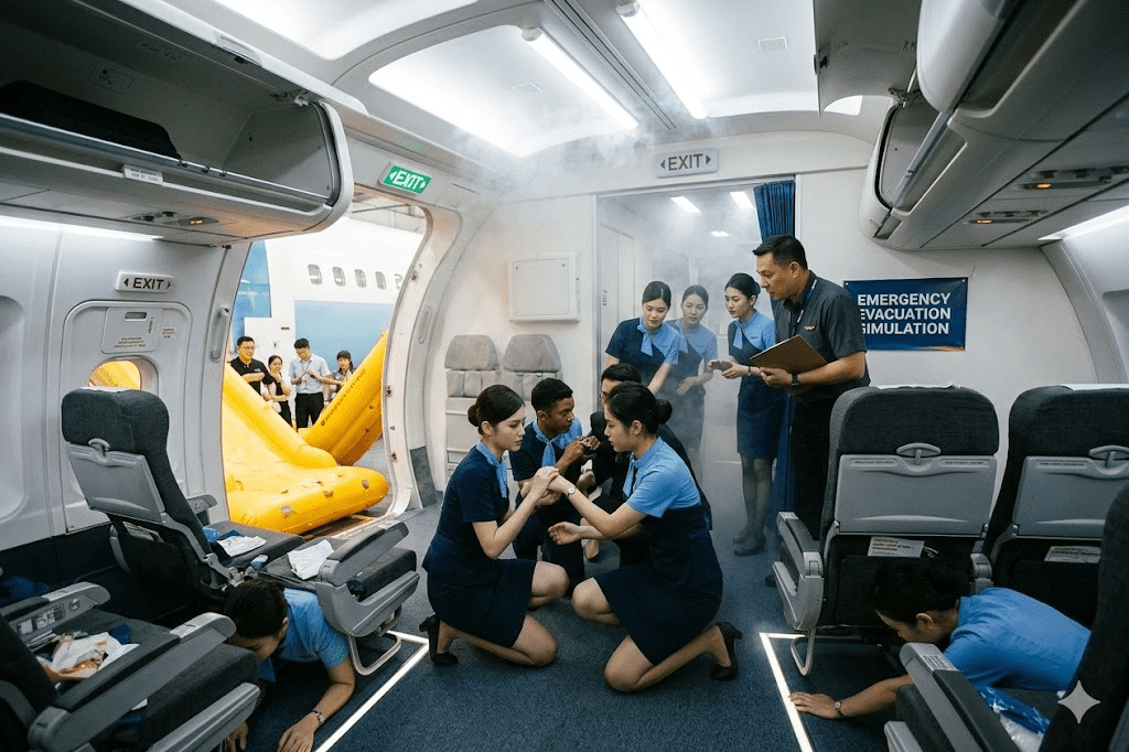 Selain pembelajaran teori, siswa juga menjalani simulasi kondisi darurat seperti evakuasi penumpang, penggunaan life vest, penanganan kebakaran kecil di kabin, dan prosedur pendaratan darurat. Praktik ini biasanya dilakukan di mock-up cabin agar lebih realistis. Di sinilah mental, ketenangan, dan refleks cepat dilatih. Dalam dunia penerbangan, keselamatan selalu menjadi prioritas utama.