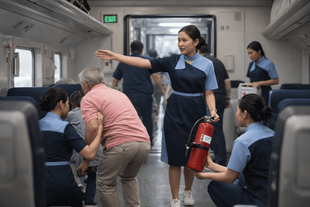 Pelatihan ini juga menekankan pentingnya ketenangan dan kesiapan mental saat menghadapi situasi yang tidak terduga. Pramugari kereta api harus tetap fokus, berpikir cepat, dan mengambil keputusan yang tepat demi menjaga keselamatan penumpang. Oleh karena itu, siswa biasanya mengikuti berbagai latihan simulasi yang menggambarkan kondisi darurat secara realistis.